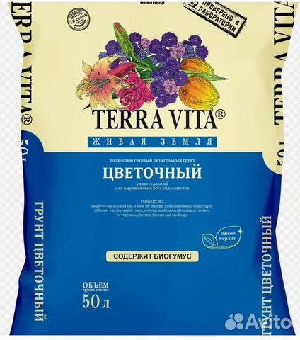 Грунт Terra Vita Живая Земля цветочный 50 л- полностью готовый питательный грунт, применяется для посадки и пересадки всех видов цветочных и декоративных культур, выращивания рассады и укоренения черенков.