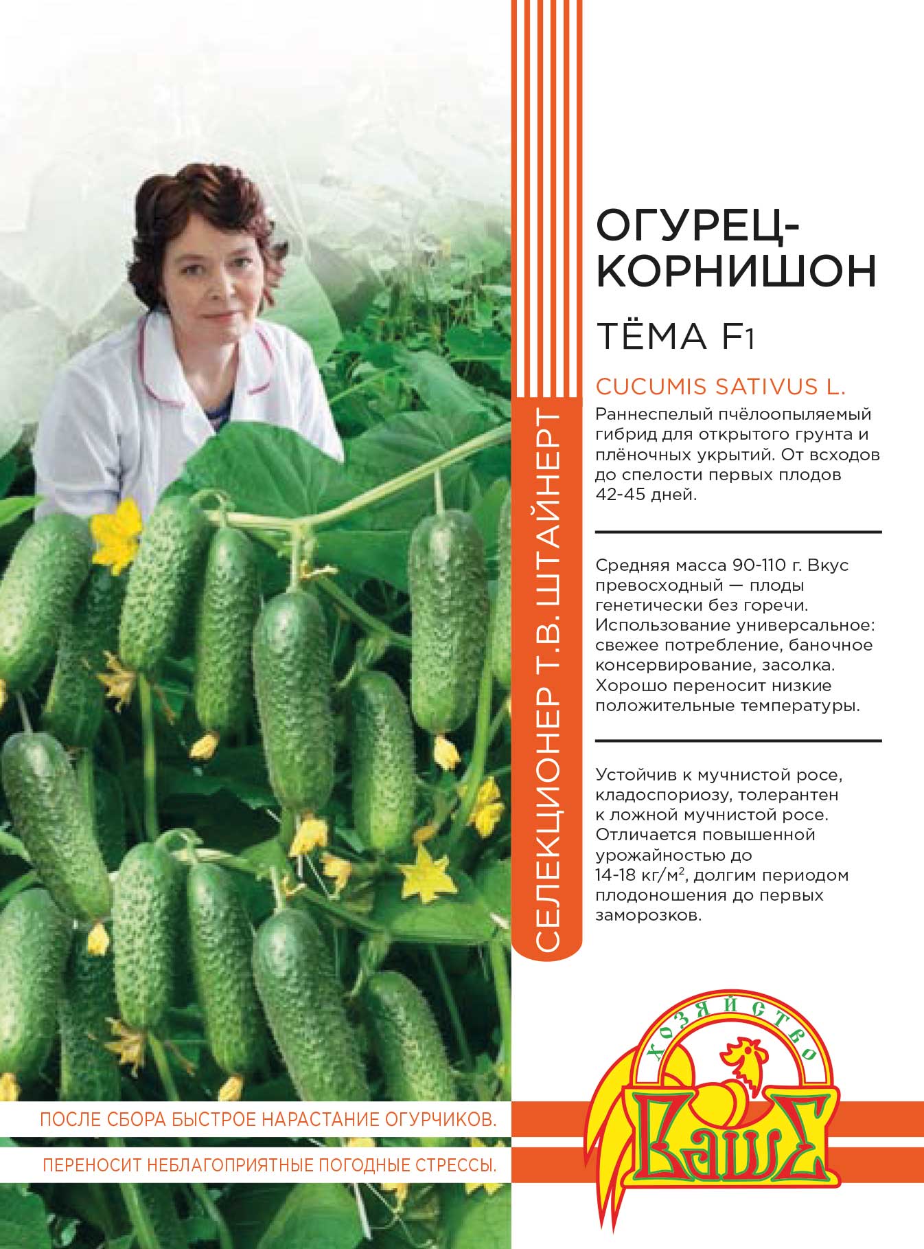 Среднеранний (40-42 дня) партенокарпический гибрид преимущественно женского типа цветения, универсального использования, для выращивания в открытом грунте и под пленочными укрытиями. Зеленцы цилиндрические, крупнобугорчатые, черношипые, хрустящие, без пустот и горечи, длиной8-10см, массой 75-85г. Урожайность более 10кг/м2 . Ценность гибрида: высокая урожайность, отличные вкусовые качества, отлично переносит температурные стрессы, устойчивость к болезням.